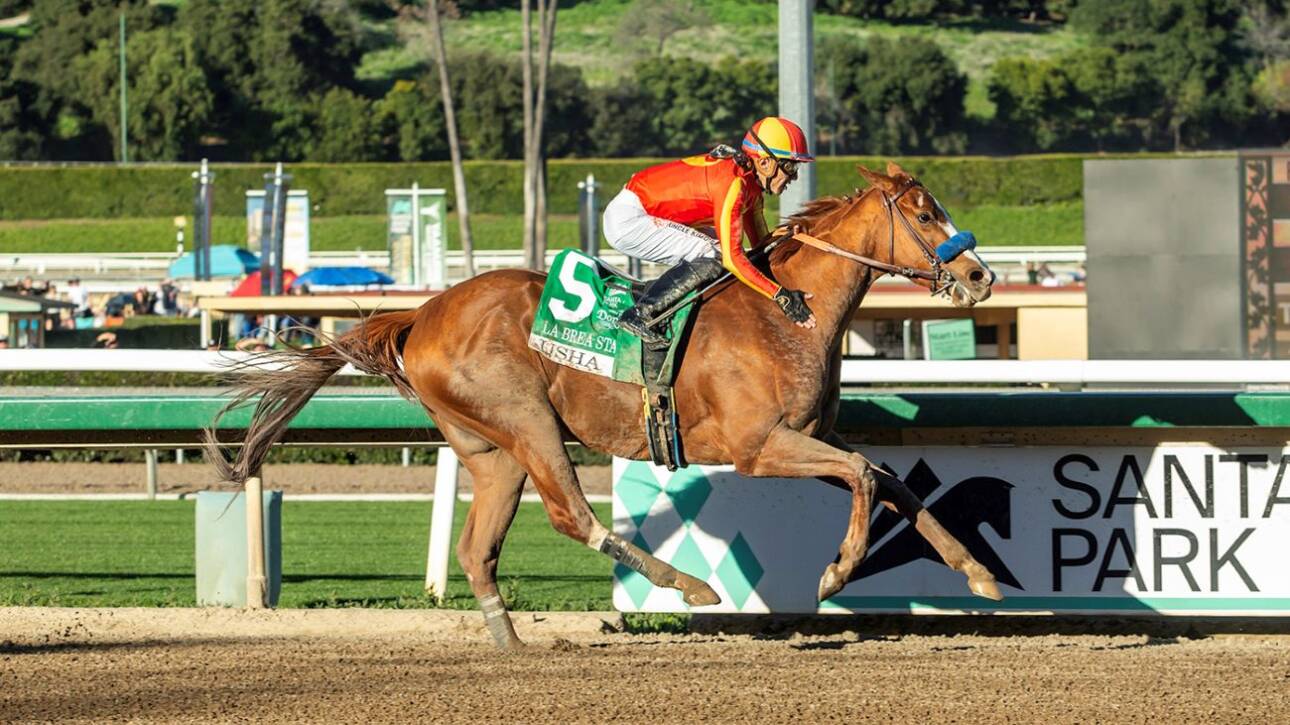 “Usha showed up today,” Baffert told Santa Anita publicity. “She came back here and that worked well. We expected this when I shipped her to Kentucky, and didn’t win a race, but today she showed up.”
